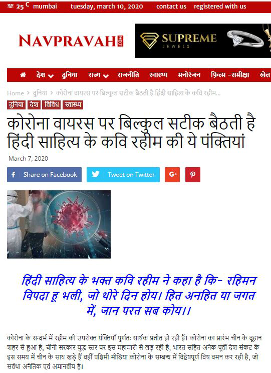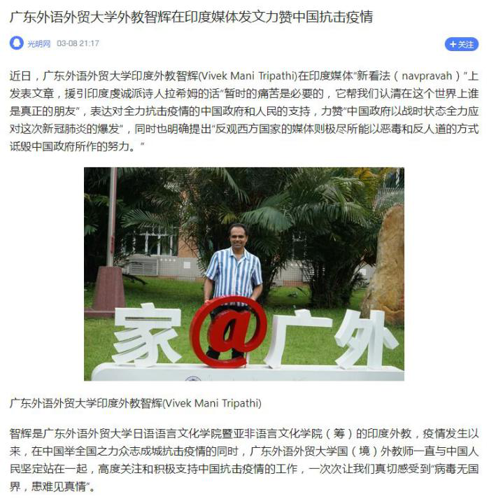 Recently, Vivek Mani Tripathi, an Indian teacher at GDUFS, published a commentary article on the Indian website Navpravah, in which he quoted an Indian pious poet:” Temporary bitterness is necessary. It helps us recognize our real friends in the world”. He expressed his support for the Chinese government and Chinese people as they spare no efforts to fight against the epidemic, and highly praised Chinese government’s aggressive response to the outbreak of the COVID-19.