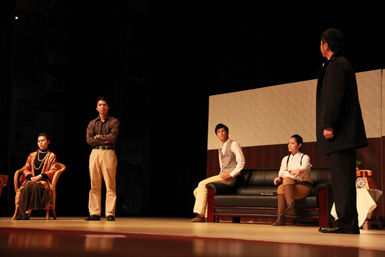 The fourth play Twelfth Night was eye-catching from the very first second. The curtain draws up and a clown appears in the limelight. He is full of color as well as vigor; he speaks with a lyrical tune and moves like an electric toy, but his words are witty. At first, every character appears on the stage motionless! The clown moves here and there to introduce their relationship to help us clarify a story which is about courting and mismatched identity and he toys with each character as if they were a sculpture. Typical of a Shakespearean comedy, the play is jolly with light teasing. The clown added to the comedic effect and helped the audience to emotionally connect with the play. The performers fully used the stage to engage the audience in their acting. To the surprise of audience, a captain cuts a hole on the screen with a sword and jumps right through it with agile moves to fight with a Duke. The captain even went down stage to face the audience as if they were passengers on the road. The whole play was a jolly treat for the eye and it filled the performing hall with surprise and laughter.