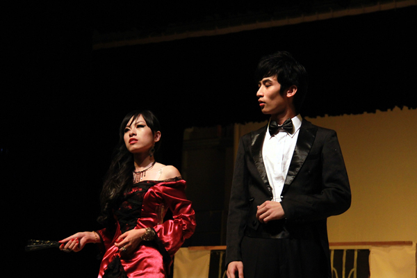 The curtain went up at seven where four stunning hosts and hostesses appeared on the stage. They introduced us to the first play, "An Ideal Husband", a comedic stage play by Oscar Wilde, which is about blackmail, honor, love and marriage -topics as old as human beings. An Ideal Husband opens during a dinner party at the home of Sir Robert Chiltern in a fashionable and luxurious setting. Sir Robert and his wife, Lady Chiltern, are hosting a gathering that includes his friend Lord Goring, a close friend to the Chilterns. During the party, Mrs. Cheveley, an enemy of Lady Chiltern's, attempts to blackmail Sir Robert into supporting a fraudulent scheme to build a canal in Argentina. Apparently, Mrs. Cheveley knows that Sir Robert made his fortune with illegitimate money, and Mrs. Cheveley has the letter to prove his crime. Fearing the ruin of both career and marriage, Sir Robert submits to her demands. There are four scenes in the play which unravel the plot for us. The actors fully used the setting and the stage to build up the tension and then released it with a happy but thought-provoking ending.