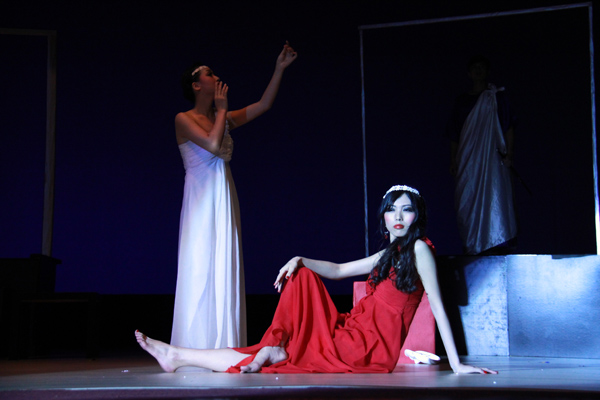 After an intermezzo of singing and Latin dancing, the third play was on, "Phaedra", a dramatic tragedy based on Greek mythology. In the absence of her royal husband Th閟閑, Phaedra ends by declaring her love to Hippolyte, Th閟閑's son from a previous marriage. This play features the inner struggle of Phaedra who is presented to us using two actresses: one in white, representing Phaedra as the queen and the other one in red, living out the desire and self of Phaedra. They effectively used different colors for symbolism. Their play was elegant and they successfully kept the original poetic quality of the play after adaptation, giving the audience a glimpse into the far-back and mysterious life and love of ancient Greece.
