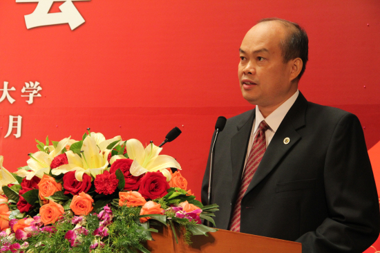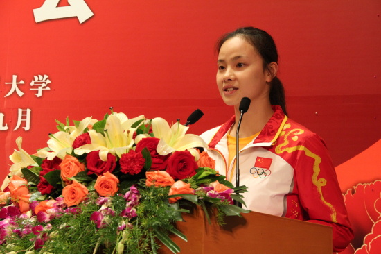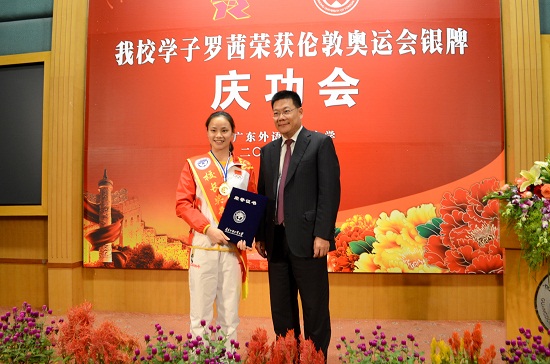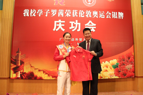 President Zhong delivered a speech at the celebration. He congratulated Luo Qian on her excellent performance and on achieving outstanding results at the London Olympics. He also expressed his gratitude for the teachers and students who have been supporting Luo for years. He mentioned that Luo's courageous striving was a vivid representation of the spirit of the Olympics-"Higher, Faster and Stronger", was the slogan of London Olympics-"Inspire A Generation". He hopes that the spirit and action of Luo will inspire teachers and students at GDUFS and will be planted into the depth of their hearts. Finally, he hopes that Luo will continue exerting herself and constantly transcending herself. He shared his wish that Luo's future will be even more brilliant.