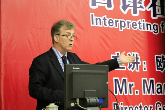 November 29th--Mr. Marco Benedetti, the Director General of Directorate General for Interpretation at the European Commission (also known as SCIC), together with Mr. Paul Brennan, China's correspondent of DG Interpretation, lectured on Interpreting for the European Institutions: Multilingualism in Action. The lecture was held by the Party Propaganda Department and organized by the School of Interpreting and Translation Studies.