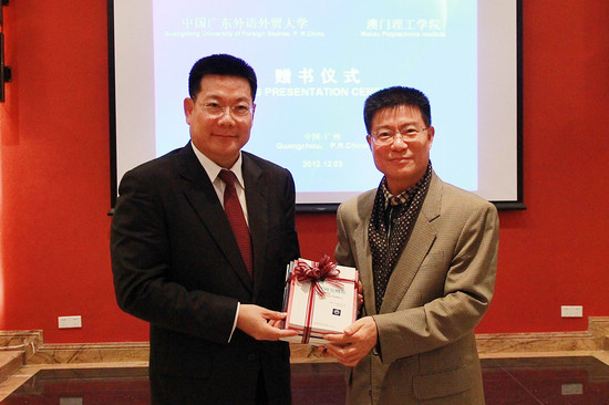 Macao Polytechnic Institute gave a lot of original Portuguese-written books to our school at the last meeting in Macao. In order to show our gratitude, President Zhong donated books written by the teachers from the School of Interpreting and Translation Studies to them. Mr Li replied with a smile"We share our resources by donating books. "and gave souvenirs with Macao Polytechnic Institute's school motto to our school.