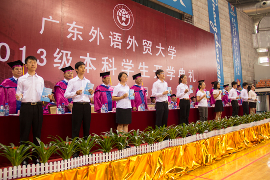 The opening ceremony for undergraduates of Class 2013 was held in GDUFS on Sep.9th, 2013. Over five thousand freshmen attended the " First Lesson" with their school badges on.