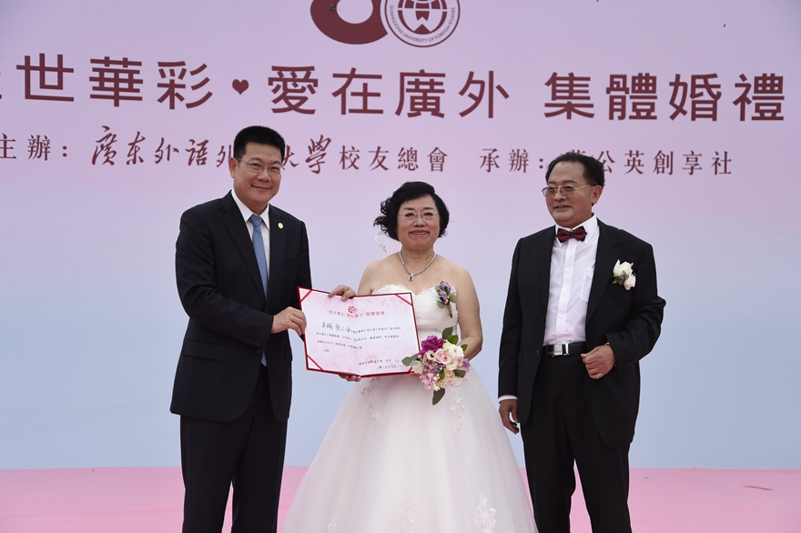 To begin with, ZHONG Weihe, the President of GDUFS gave a meaningful and profound speech to the audience. Then he presented the group wedding certificates to all the married couples.