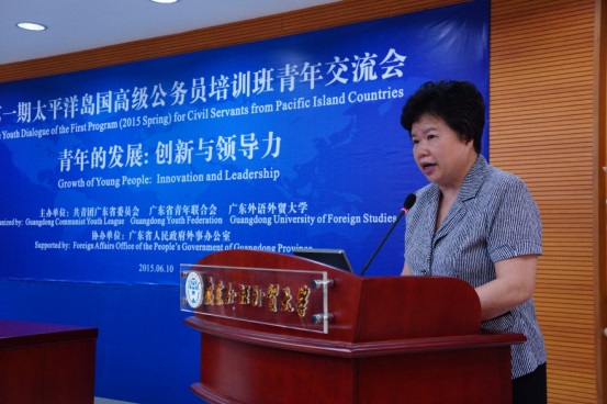 On June 10th, the Youth Dialogue of the First Program (2015 Spring) for the Civil Servants from the Pacific Island Countries was held in room 301, in the No. 6 Teaching Building. Twenty-four (24) senior civil servants from Fiji, Micronesia, Samoa and Tonga attended the meeting and exchanged views on the subject of “The Growth of Young People: Innovation and Leadership” along with representatives of outstanding youth from the Youth League Committee of Guangdong Province and the Youth Federation of Guangdong Province. Hosted by LIANG Xuehong, Dean of the Institute for International Education, the meeting was also attended by SU Caifang, Deputy Director of the Foreign Affairs Office of Guangdong Province; ZHANG Zhihua, Deputy Secretary of the Youth League Committee of Guangdong Province and ZHONG Weihe, President of Guangdong University of Foreign Studies.