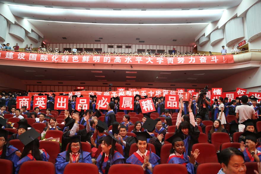 Our youth was blossomed with the bauhinias; we ourselves grew into mature adults in the company of each other. Another year came the hot sunshine and the drifting Xiangsi River. On 23rd June, the first session of GDUFS’s summer graduation ceremony of north campus was unveiled in the Yunshan Hall. During the speech of President ZHONG Weihe, he expressed the wishes that the graduates could dare to dream, to chase and to fulfill their dreams. Diplomas were conferred on the graduates by ZHONG.