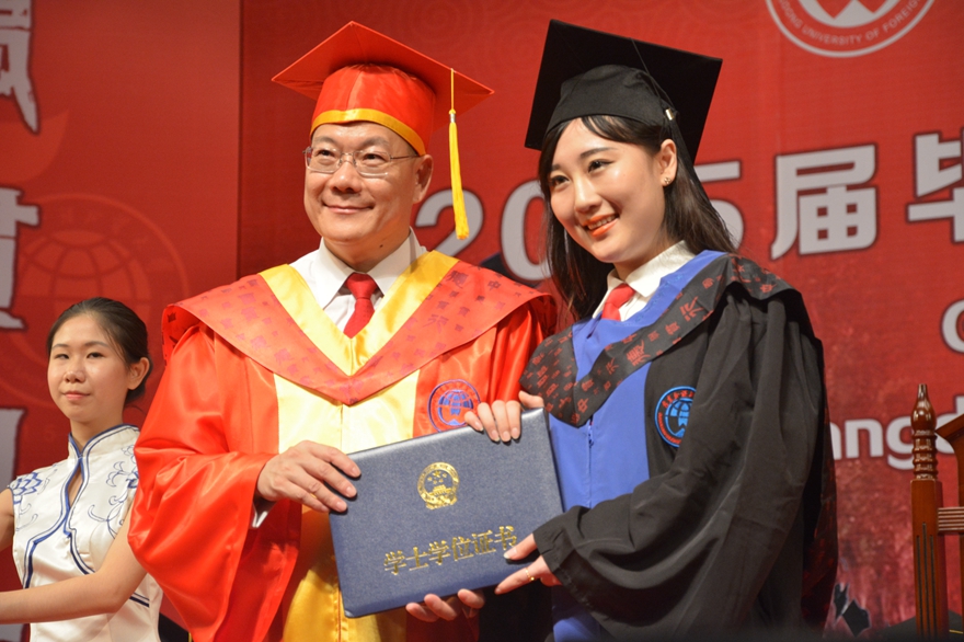 Jiaping JIN, an alumni representative graduated from the Faculty of European Languages and Culture, told the graduates to be a professional person. Only a profession could make you a professor. He said they should be an interesting person, treating people genuinely and taking issues seriously. He said they should be a person that kept making progress and sustaining their dreams.