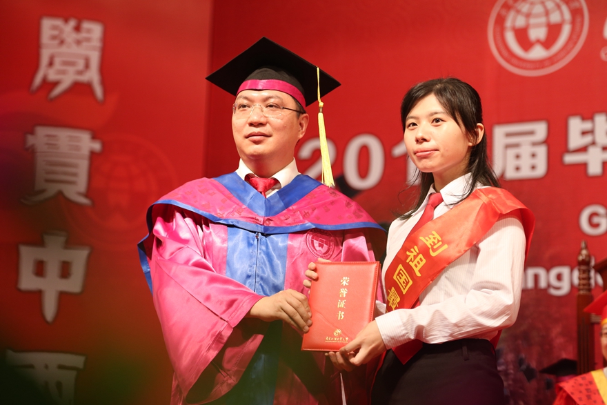 Majoring in Chinese for International Business, the international student representative from Russia described the story about her days at GDUFS, in fluent and funny but genuine Chinese, which triggered rounds and rounds of applause. She said, “Thank the teachers and friends who have given me their hands. I’ll keep the school motto in mind and keep going on.”