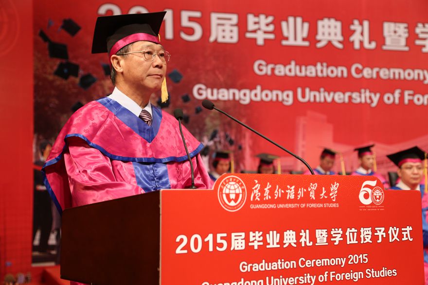 The 2015 GDUFS graduation ceremony was unveiled at the Yunshan Hall of the North Campus and the Great Hall of the South Campus sequentially. There were seven sessions in all according to the departments, centers or institutions. The first one was held for the Center for Foreign Culture, the Center for Art, the Institute for International Education, the School of English for International Business and the Faculty of European Languages and Culture. Those attending included GDUFS Party Secretary CHEN Jianping, Vice-Presidents LIU Jianda and LIU Haichun, and the delegations of tutors, alumni and parents of the graduates. The first graduation ceremony was hosted by LIU Jianda.