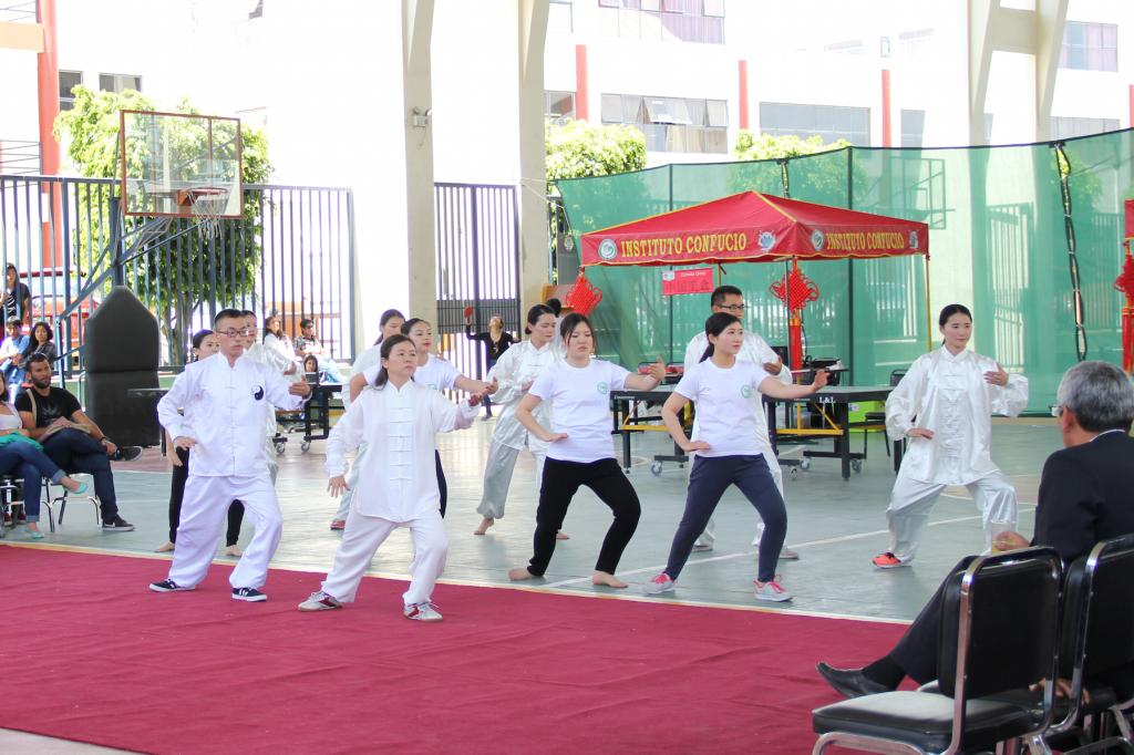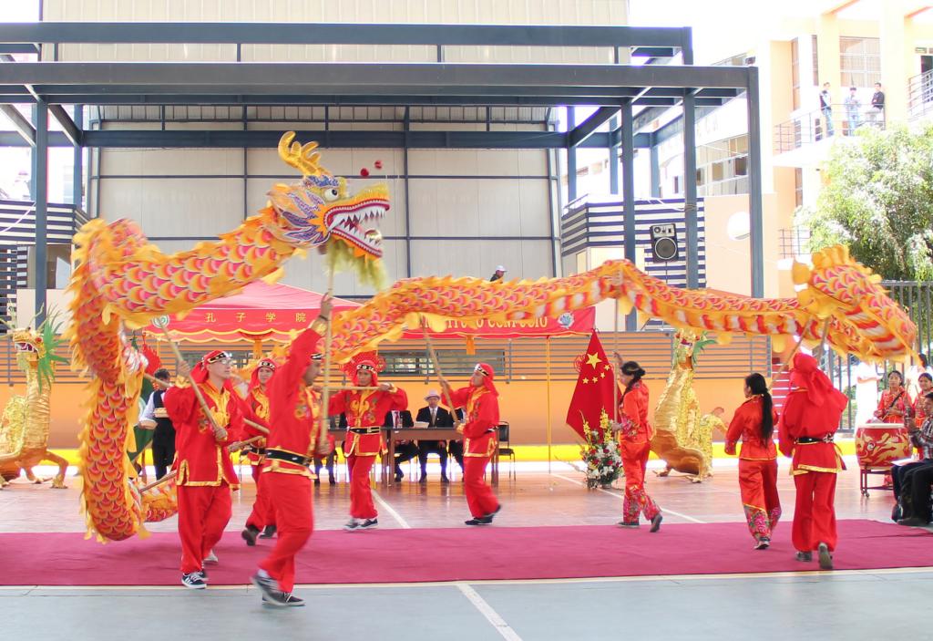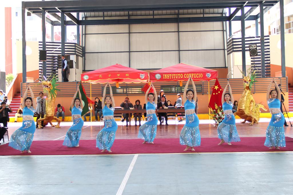 After the celebrations ceremony, the teachers and students of the Confucius Institute presented a brilliant performance. With gongs and drums ringing out, the lifelike golden dragon and glittering lion marched in one after another, quickly creating a bright atmosphere. Hot Xinjiang Dance performed by female teachers and a curvaceous pavane enthralled the whole audience. The performance of Chinese shadow boxing and Taiji-fan, in which there was strength as well as grace, showed the backbone of integrity in a free flowing graceful manner. Moreover, the Peruvians were deeply fond of the dance “Little Apple” performed by teachers and students together. The performance aroused rounds of applause from the audience, along with flashlights flickering continuously.