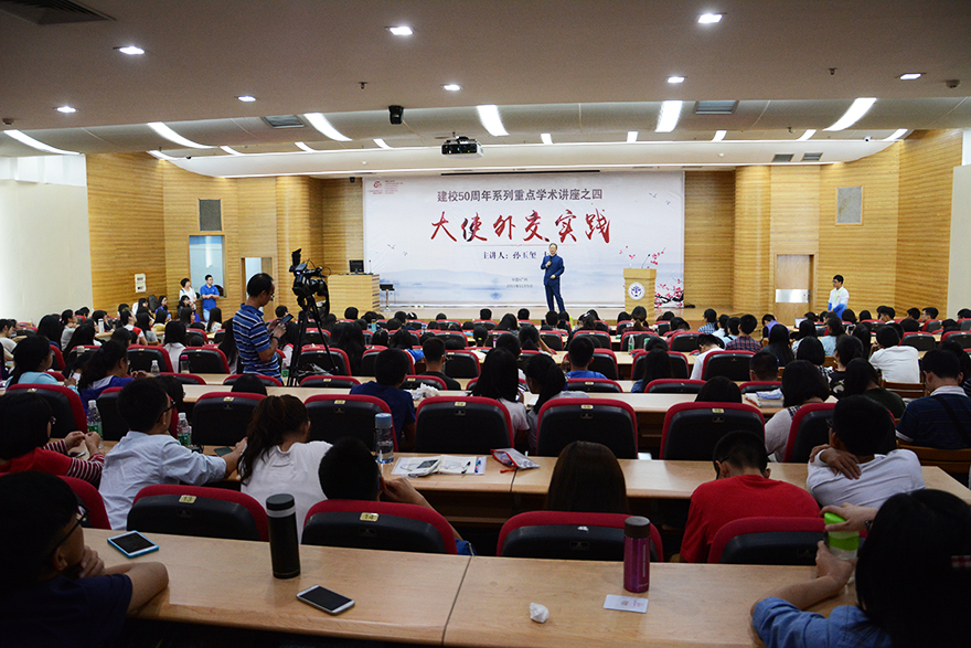 Envoy SUN Yuxi has been engaged in diplomacy for 38 years and has visited 138 countries. He made great contributions to the peace of China and other countries. In the lecture, he showed lots of his pictures of diplomacy, telling interesting stories about the pictures. Students crowded in the lecture hall, listening carefully and applauded from time to time.