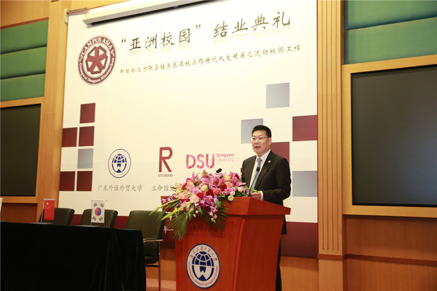 On the morning of 17th January, the Campus Asia commencement ceremony was held at Guangdong University of Foreign Studies. Ms. Chen Yinhui, Deputy Director-General of the Department of International Cooperation and Exchange from the Ministry of Education, China; Mr. Meize Zhangma, Deputy Secretary-General of Trilateral Cooperation Secretariat; Hu Zhengmin, Deputy Inspector of Department of Education of Guangdong Province; President Zhong Weihe of GDUFS; President Jitian Meixifu of Ritsumeikan University, and President Zhang Jiguo of Dongseo University attended the ceremony and gave speeches, in which they all expressed their congratulations to the students and teachers, as well as their best wishes to this program. “I hope that graduates of this program will bring their talents into full play.” President Zhong said.