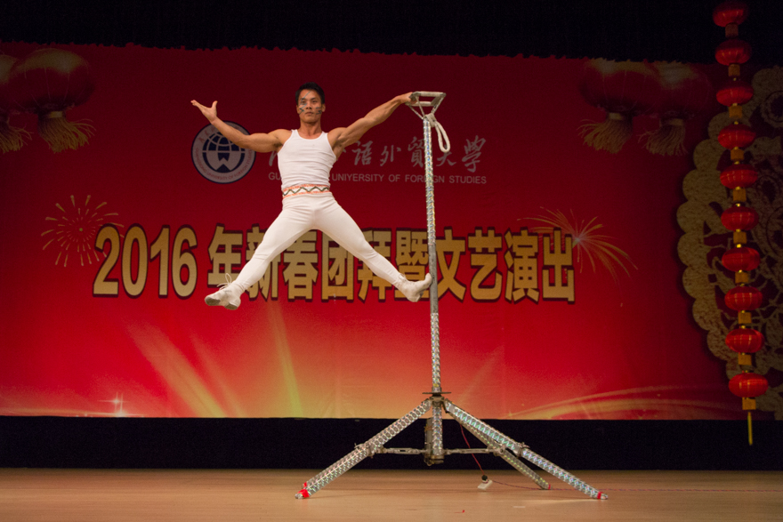 HU, an acrobat of the Art group of Shenzhen, performed a traditional acrobatic routine with a history of over 2,000 years. Making use of a simple steel frame, he walked on air as if he walked in space, getting rid of gravity. Everyone applauded his amazing performance.