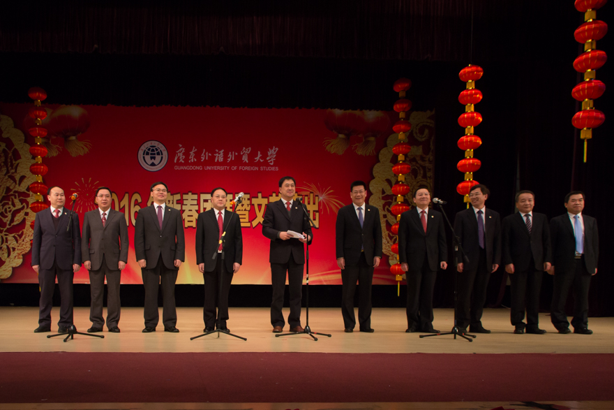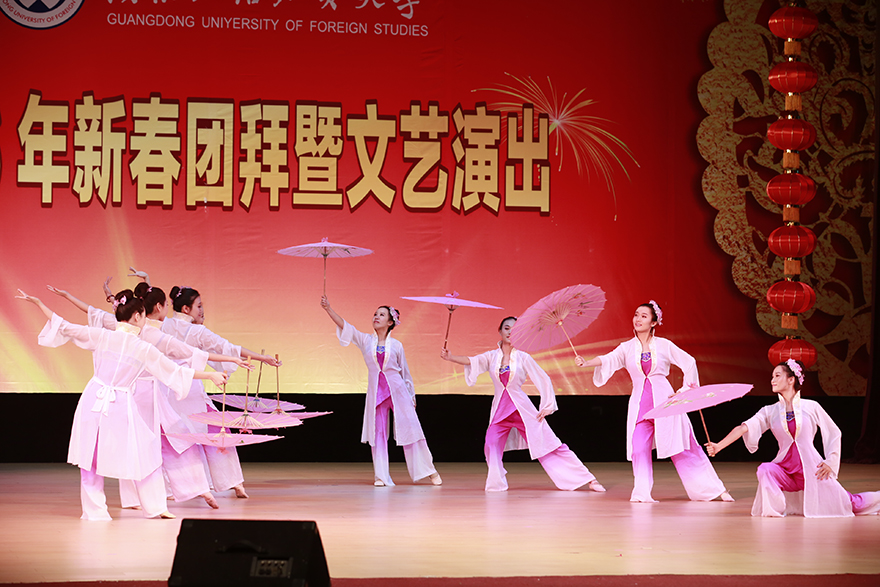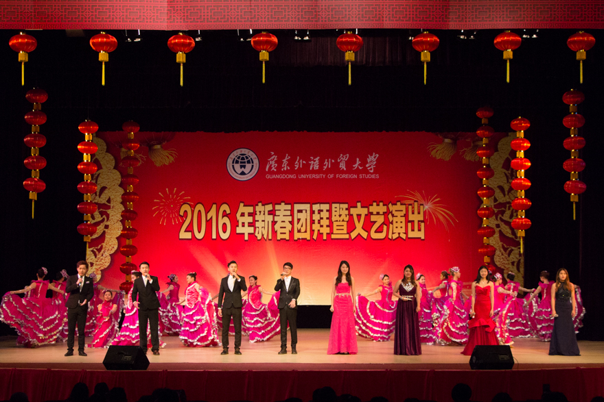 On January 21, 2016, art performances were held at Yunshan Hall by GDUFS to celebrate the coming Spring Festival. All teachers, including those from the south campus, attended and enjoyed the show. It was raining and cold outside, but people had a joyful gathering inside.