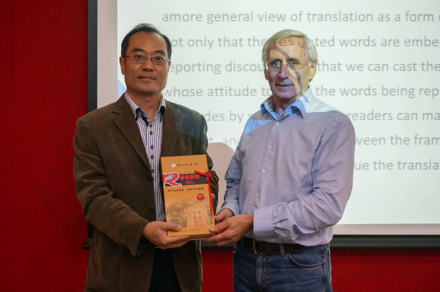 At the beginning of the speech, CHU DongWei, Professor of the School of Interpreting and Translation Studies, expressed both a warm welcome to Professor Hermans and his appreciation of the translations written by Hermans, saying that Hermans’s books had taught him a great deal. After this, the Dean of School of Interpreting and Translation Studies, ZHAO JunFeng, presented a gift to Professor Hermans on behalf of the whole faculty.