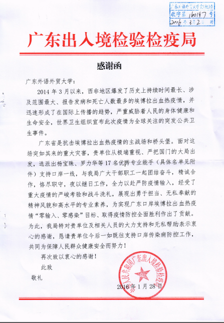 In March, GDUFS received a thank-you note from Guangdong Entry-Exit Inspection and Quarantine Bureau, for the strong support and selfless help of volunteers who survived the ordeal of severe epidemic and harsh combat, in which they had showed their courage, selfless dedication and a high level of professionalism. Volunteers had made their great contribution to realizing the objective of zero input, zero infection of Ebola hemorrhagic fever at Guangdong port of entry, and overall success of epidemic prevention and control.