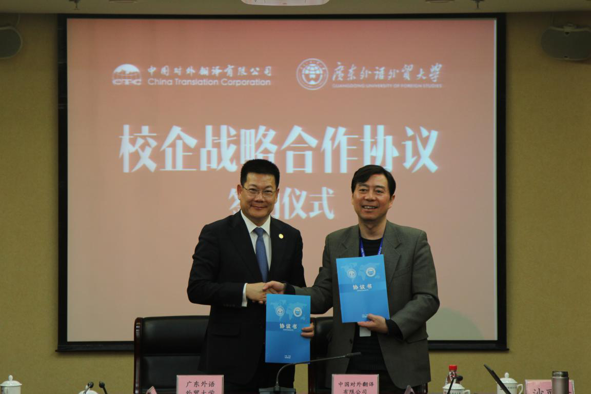 At the signing ceremony, President ZHONG pointed out that strategic co-operation between GDUFS and China Translation Corporation was significant, which attaches importance to cross-language big-data think tanks, machine translation, speech recognition and CAT, and so on. HUANG Song said that as the industry leader, China Translation Corporation would spare no effort to promote the collaborative innovation about technology resources and platforms with GDUFS and build the new cooperation model of “language + big data + strategic coalition”.
