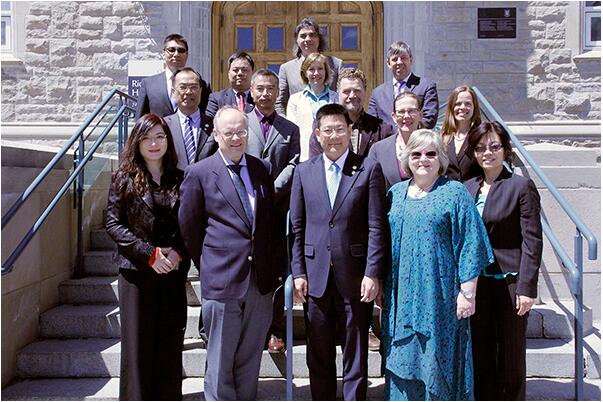 In photo, front from left: Cai Hong, Director of International Office, GDUFS; Hugh Horton, Associate Dean (International), Faculty of Arts and Science; Zhong Weihe, President, GDUFS; Rebecca Luce-Kapler, Dean, Faculty of Education; and Liying Cheng, Teaching English as a Second/Foreign Language, Faculty of Education. Middle row: Zhao Junfeng, Dean of School of Interpreting and Translation Studies; Zhiyao Zhang, Director, China Liaison Office; Barbara Yates, Associate Director, International, Office of the Associate Vice-Principal (International); Craig Walker, Director, Dan School of Drama and Music; Robin Cox, Director, School of English, Faculty of Education; and Jenny Corlett, Associate Director (International Initiatives), Faculty of Arts and Science. Back row: Wang Weiqiang, Associate Professor, School of English for International Business, GDUFS, and Visiting Scholar at Queen’s; Xie Wenxin, Director of Human Resources Division, GDUFS; Donato Santeramo, Head, Department of Languages, Literatures and Cultures; and Don Klinger, Associate Dean Graduate Studies & Research, Faculty of Education.