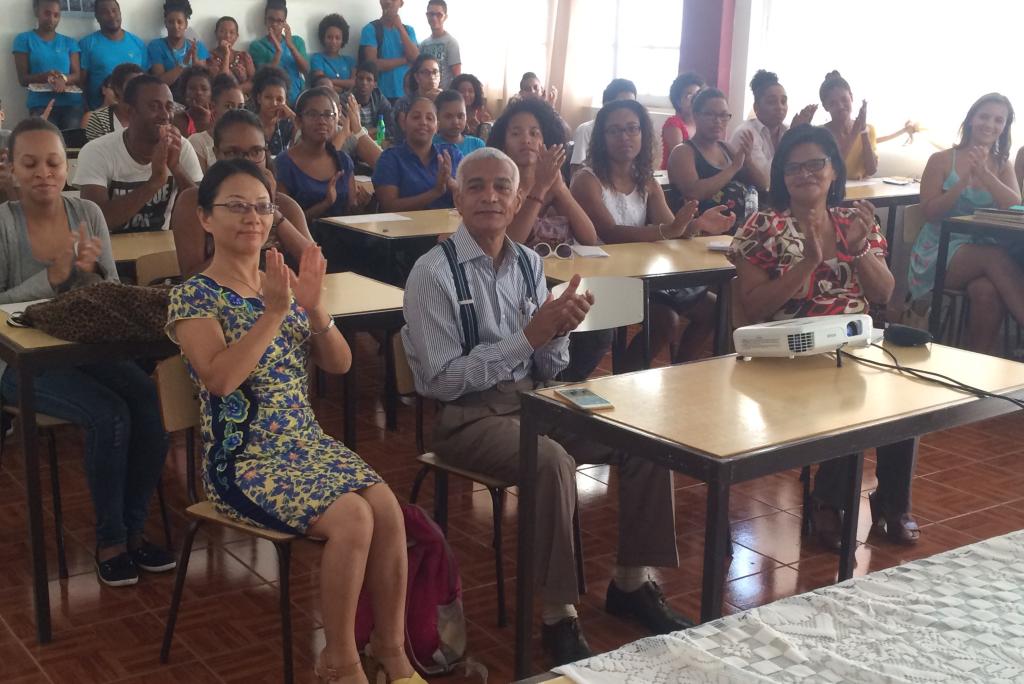 This public lecture consisted of three stages. During the first stage, students were taught about how to greet and introduce themselves in Chinese. They learned how to say some words and sentences such as “hello”, “China” and “Cape Verde” in Chinese.