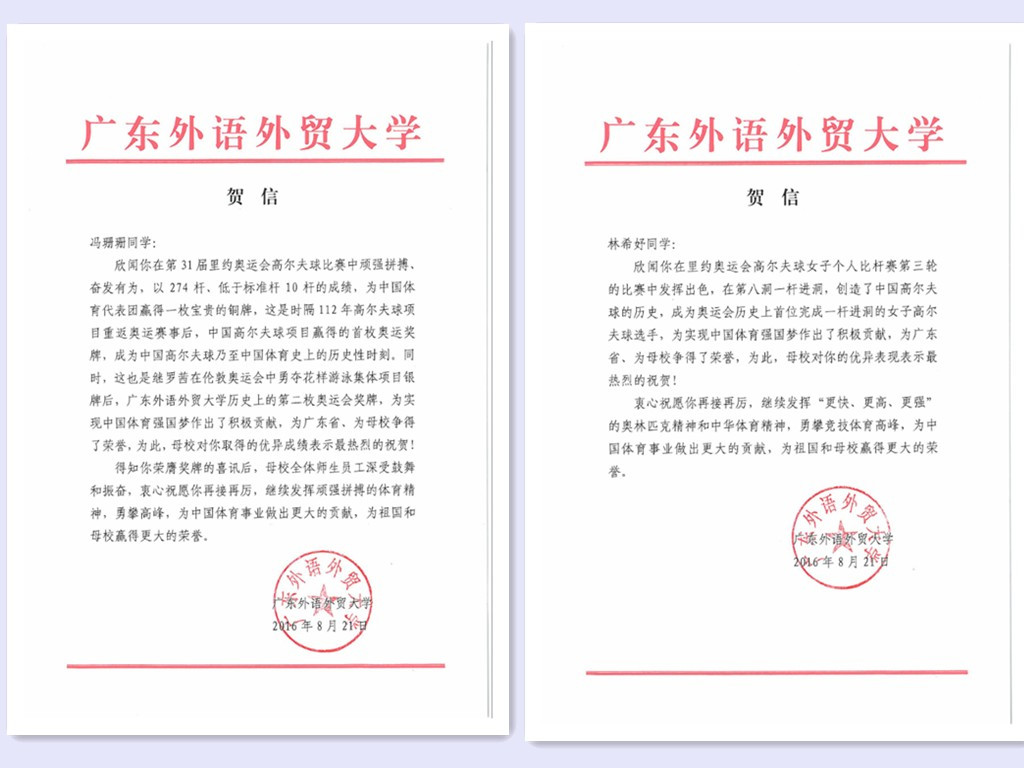 Before the Rio Olympics, SUI Guangjun, the Secretary of Party Committee of GDUFS and ZHONG Weihe, the President of GDUFS, sent best wishes to FENG and LIN. GDUFSers also cheered for the two athletes during the competition. Guangdong Golf Association and GDUFS sent congratulatory letters to the two after the Games, praising their wonderful performances in Rio, which had interpreted the Olympic spirit, inspiring national patriotic enthusiasm.