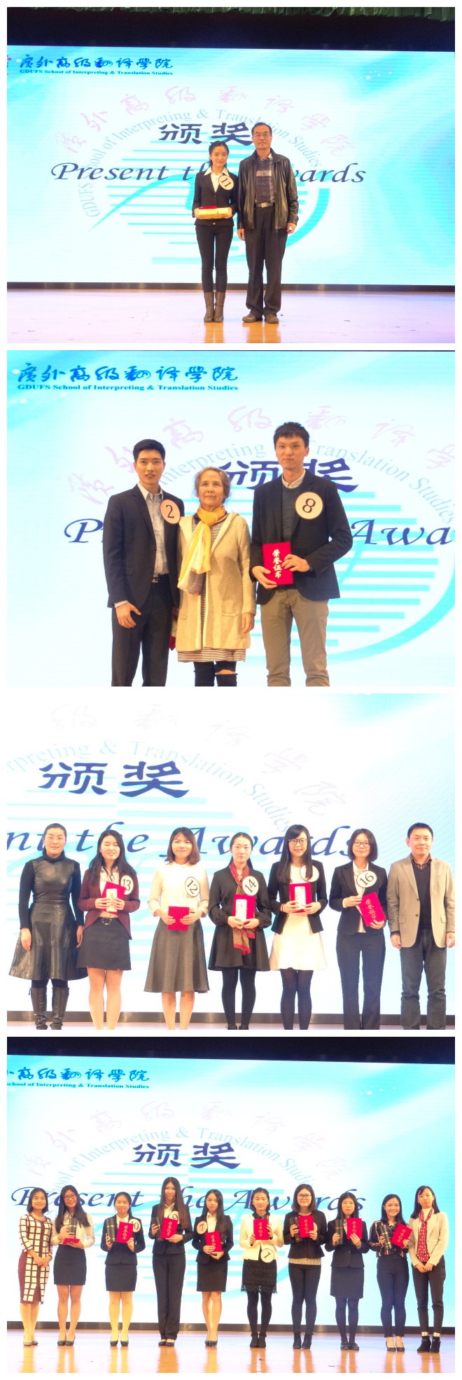 At last, the hosts announced the awards. The first prize went to SUN Lianmi, student from the Faculty of English Language and culture, who demonstrated a large bank of vocabulary, accuracy and fluency in interpreting. The 6th“SITS CUP” Interpreting Contest culminated with a group photo marking this unforgettable night.