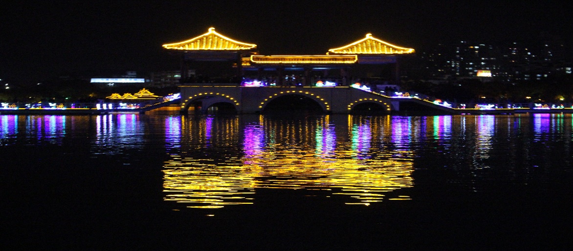 The bridge over the West Lake is decorated with lights
