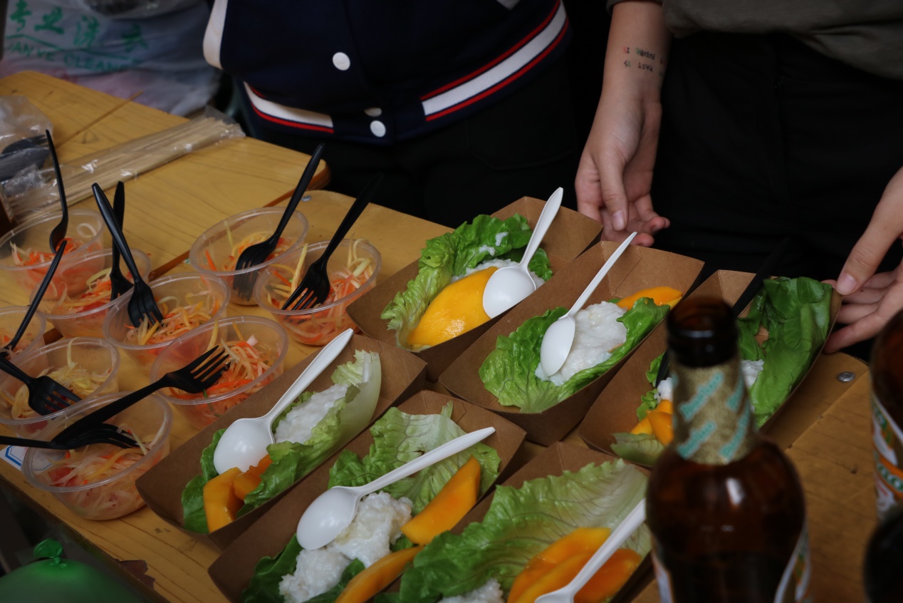 At 2:30 in the afternoon, the delicious aroma of various specialties started to fill the air. Long queues of students stood in front of the stalls of different countries to taste the unique flavour of the specialties. Specialties like Arabian Barbecue, glutinous rice with mango and coconut milk from Thailand, and Korean Topokki (a kind of popular Korean food made from long, white, cylinder-shaped rice cakes) were demonstrated on the main avenue to attract people. We tasted the Vietnam Spring Roll, which is a kind of cuisine made of meat, vegetables and the wrapper. The meat and vegetables are rolled in a rice paper or wheat flour wrapper and deep-fried to golden brown deliciousness. A student we interviewed told us that she liked the Arabian Barbecue the most, which appealed to a lot of students.
