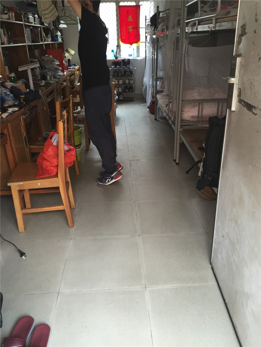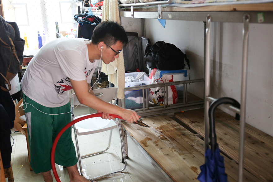 Room 115 of the No.9 dorm building has been thoroughly cleaned already. With senior students living there, it only had one student in the dorm when the water flowed in. Thanks to the reminding of the dorm supervisor, he quickly shut the door, packed the clothes and tried his best to move all his roommates’ stuff to high places. “A lot of dorms had no students in last night. There were four students in that dorm who directly headed to the supervisor for keys to help move stuff in other dorms.” It was because of the effort of several remaining students, the loss of all people was not so big.
