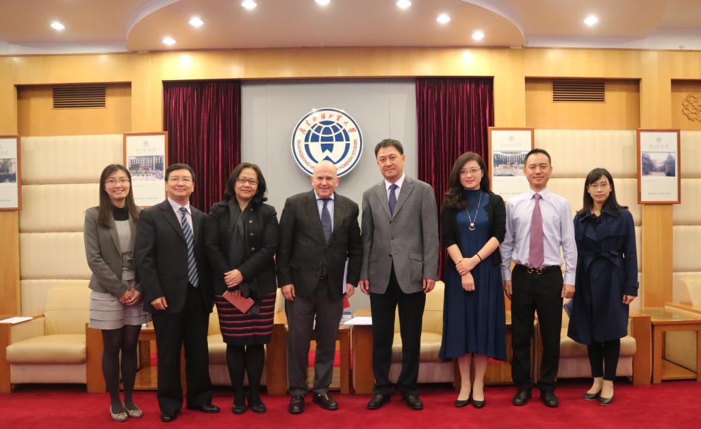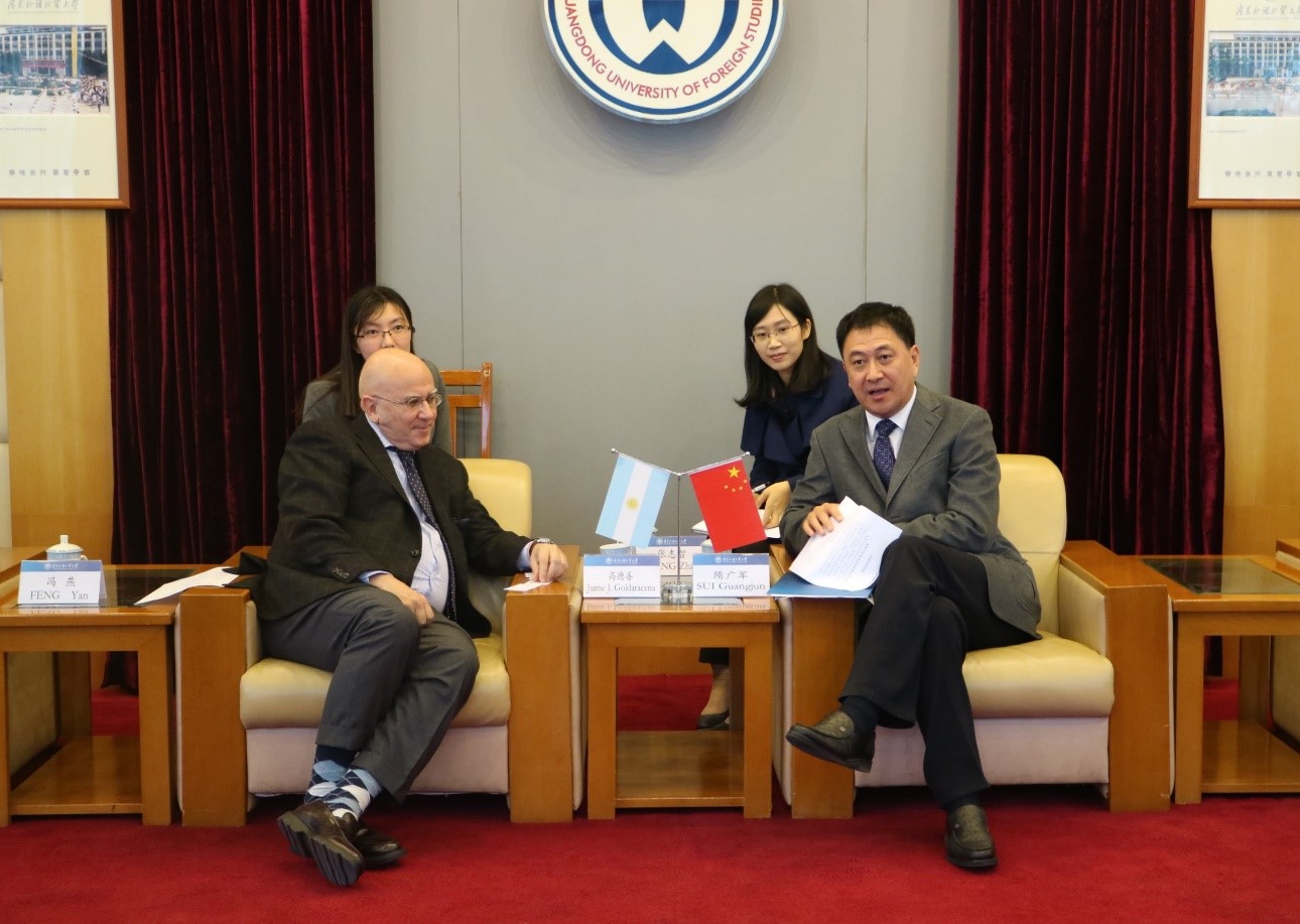 On December 7th 2017, Jaime J. Goldaracena, Consul General of Argentina in Guangzhou, visited GDUFS with his delegation. SUI Guangjun, General Secretary and President of GDUFS, met the guests in the VIP Room of the Administrative Building on the North Campus. CAI Hong, Chief of the Office of International Cooperation and Exchange; YANG Ke, Dean of the Faculty of European Languages and Cultures, and LIANG Xuehong, Dean of the Institute for International Education, also attended the meeting.
