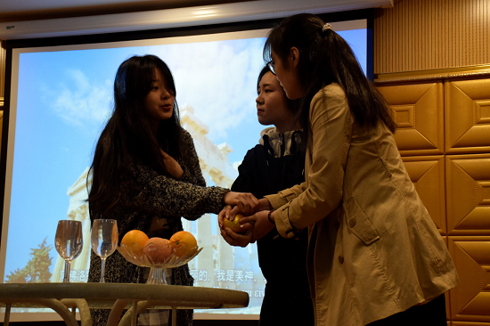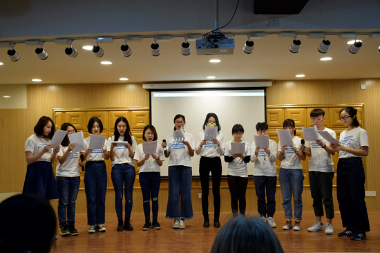 Students from the Greek Department showed their well-prepared programs. The freshmen performed the play The Golden Apple, which was adapted according to a Greek mythology. The students vividly demonstrated a series of events caused by three goddesses Hera, Athena and Aphrodite competing for the golden apple. The sophomores’ passionate singing of Greek songs was also praised by the present audience.