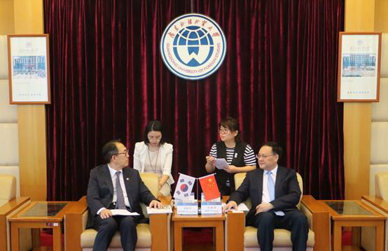 SHI Youqi briefly introduced the running situation of GDUFS to the guests. He pointed out that the Korean major in GDUFS is the first batch of special specialty construction sites of the Ministry of Education as well as the first Korean major of all universities in South China. In the last three years, the student employment rate has reached 100%. This semester, there are 103 Korean students in GDUFS, which take the largest part of all the foreign students. GDUFS has established cooperative relations with 28 Korean universities and institutions. SHI Youqi also expressed the hope of collaborating with more Korean universities in the aspects of student exchange, teacher exchange, scientific research, academic research and joint training.