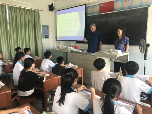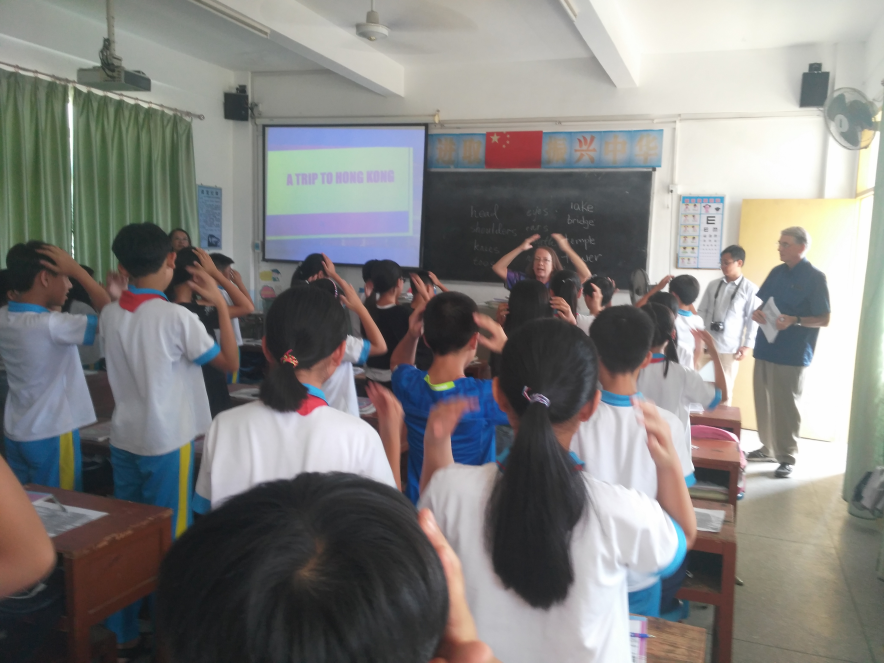The second stop of this public teaching tour was Changbin Primary School where the two professors gave an English lesson to the students in Grade Six, who never met foreigners or had class in English before. Both professors are over 60, but in order to make this hard-won English class unforgettable to children, they tried their best to prepare for the class two weeks in advance. Combining various materials for children’s English learning, they started the class with the topic One-Day Tour in Chaozhou and interspersed nursery rhymes, words and conversations into the class. Such a vivid lesson provided a pure English education to those students who were never exposed to foreign teachers.