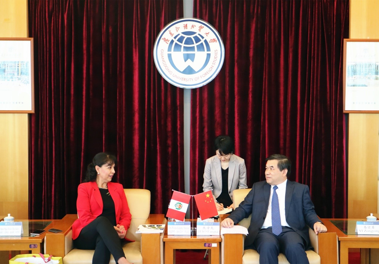 North Campus, Guangdong University of Foreign Studies, October 23rd 2018: On October 23rd the delegation from the Confucius Institute at Catholic University of Santa Maria, Peru, visited GDUFS. JIAO Fangtai, Vice President of GDUFS, met the guests in the Reception Hall of the Administration Building. The delegation talked about the construction of their Confucius Institute and other affairs with GDUFS.