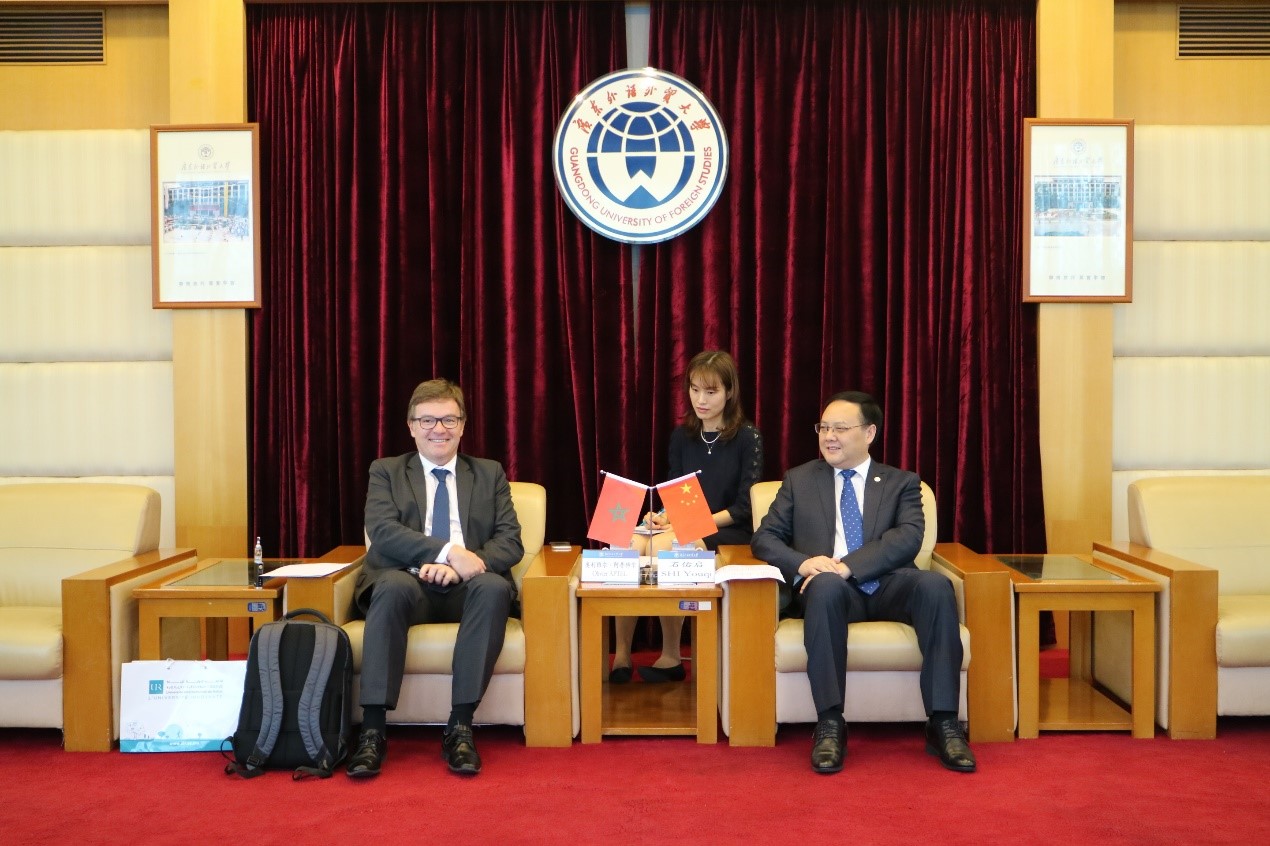 North Campus, November 16th 2018: Olivier APTEL, Dean of Rabat Business School in Morocco, and his delegation visited GDUFS. SHI Youqi, President of GDUFS, met the guests in the Reception Hall of the Administration Building. They held the signing ceremony of the cooperation memorandum and student exchange programs after the meeting.