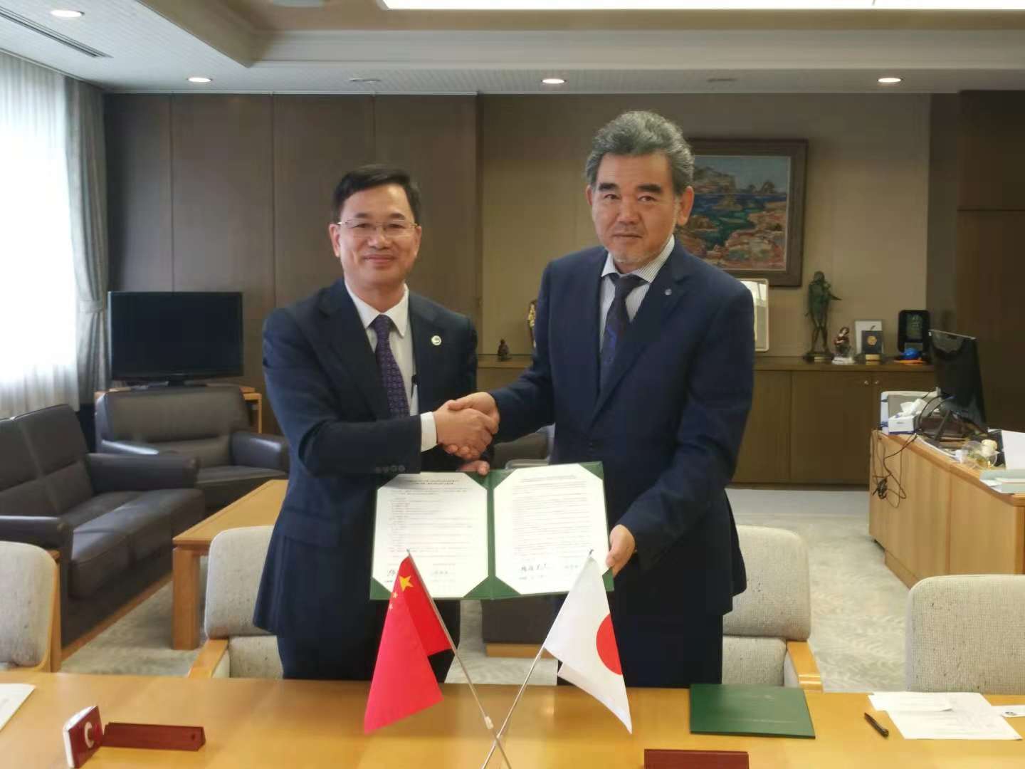 On November 19th, He Chuantian and the delegation visited Hiroshima University and met headmaster Ochi Mitsuo and deputy headmaster Sato Toshiyuki. With HE representing GDUFS, and Ochi Mitsuo Hiroshima University, they signed the Inter-school Cooperation agreement and Student Joint Training agreement. They both hoped to further enhance deep cooperation in the fields of students’ communication, scholars’ visits exchanging, and scientific studies. HE Chuantian, on behalf of SHI Youqi, President of GDUFS, invited Ochi Mitsuo to visit GDUFS in the future.