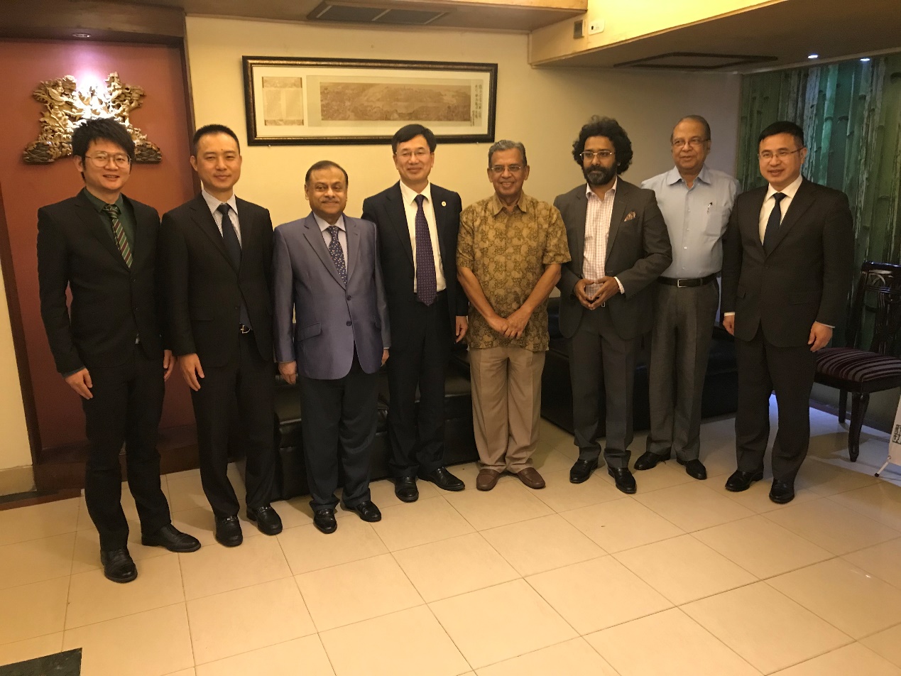 In the evening of November 20th, HE and his delegation were invited to dinner by the Bangladesh-China people's Friendship Association. The association consultant and former Foreign Minister of Bangladesh, ABUL HASSAN CHOWDHURY; the association president and former ambassador to China, C.M. SHAFI SAMI; the deputy president, MAHFUZ ULLAH; and the secretary-general, SHAHRIAR ZAMAN SHUMAN had communicated with the delegation. They reviewed the history of friendly exchanges and hoped to strengthen cooperation between each other, and to boost the cultivation of talents and cultural exchanges. A draft memorandum of cooperation agreement has been discussed and will be signed recently.