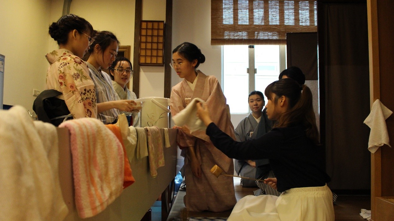 The Tea Club is staffed mainly by teachers and students from GDUFS’ Japanese department: a relationship built on harmony, support, and mutual respect. The Tea Club is divided into five groups: the flower group, sweets group, film group, kimono group and handcraft group. They hold a Tea ceremony every week, using the tokonoma to convey its particular theme. Before the Tea ceremony, the flower group picks the appropriate flowers for the meeting - but they can’t buy flowers at the florists or invade someone’s garden. They will seek every corner at GDUFS just to find the desired flowers such as jasmine and snow azalea. These help to create the perfect atmosphere for drinking tea, along with Japanese sweets brought by the club’s sweets group.