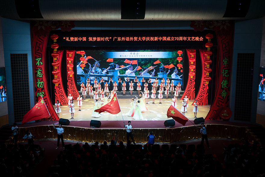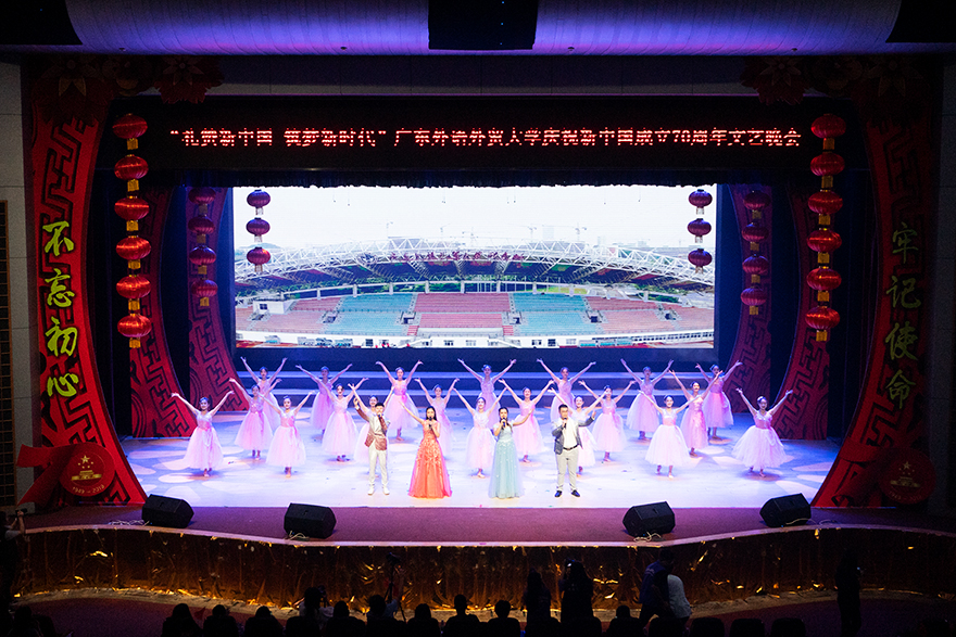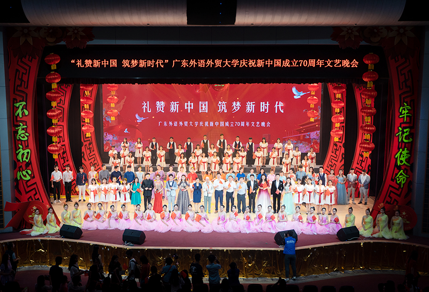 North Campus, Guangdong University of Foreign Studies, September 29th 2019: In the grand Yunshan Hall at GDUFS, a high-profile art gala in celebration of the 70th founding anniversary of the PRC, was held successfully. NING Xizhou, the Vice Leader of the "staying true to our founding mission" educating events of Guangdong Provincial Committee and the Vice President of Southern Medical University; SUI Guangjun, the Chairman of the University Board; WANG Tinghui; and JIAO Fangtai, Vice President of GDUFS, together with representatives from all faculties and departments joined the event.