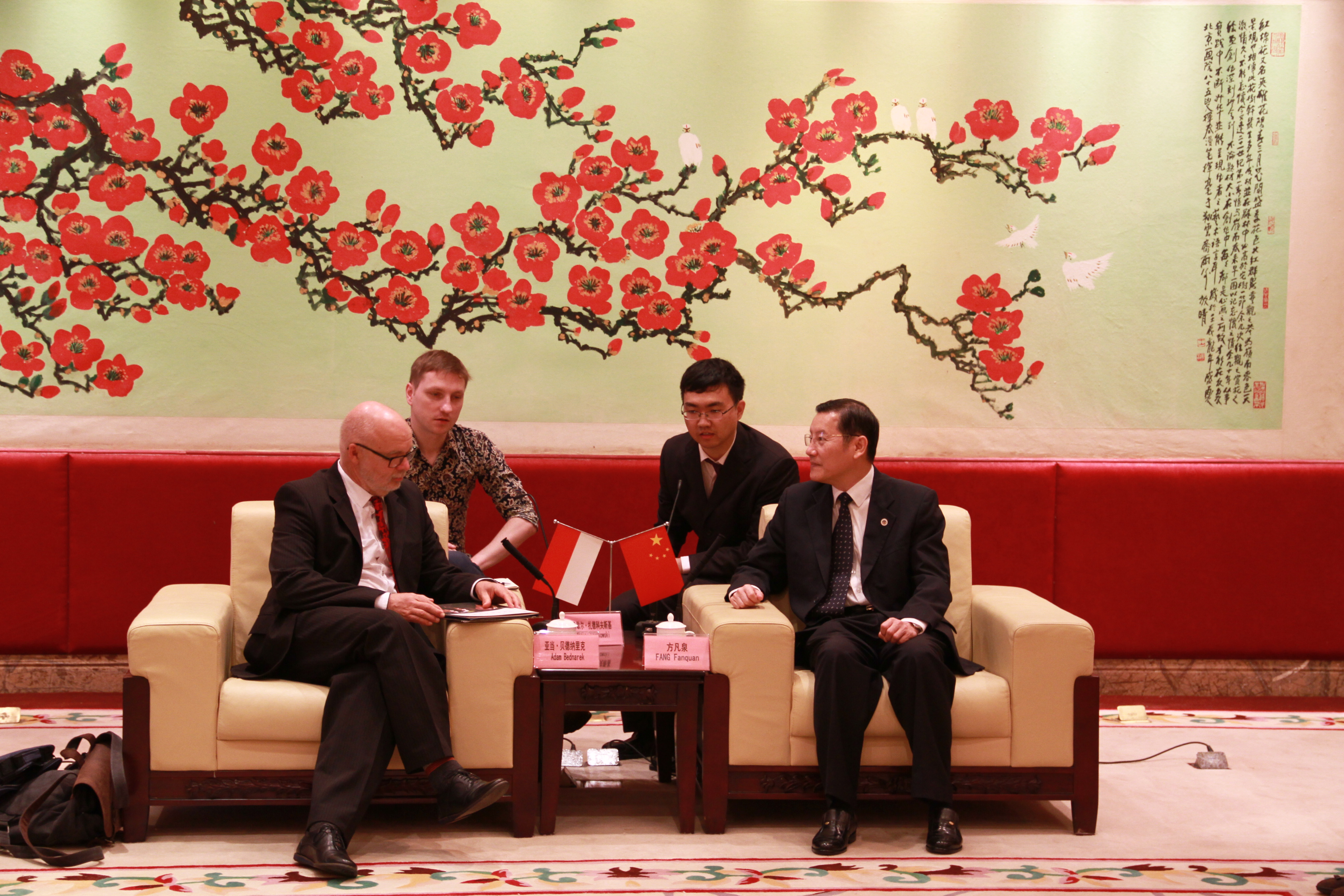 On Sep.1st, Adam, the dean of Nicolaus Copernicus University in Toruń, as well as Marschall, director of the Faculty of Chinese Language and Culture, visited GDUFS. The vice president FANG Fanquan met guests in the VIP lounge, discussing cooperation between the Polish major and the Chinese major.