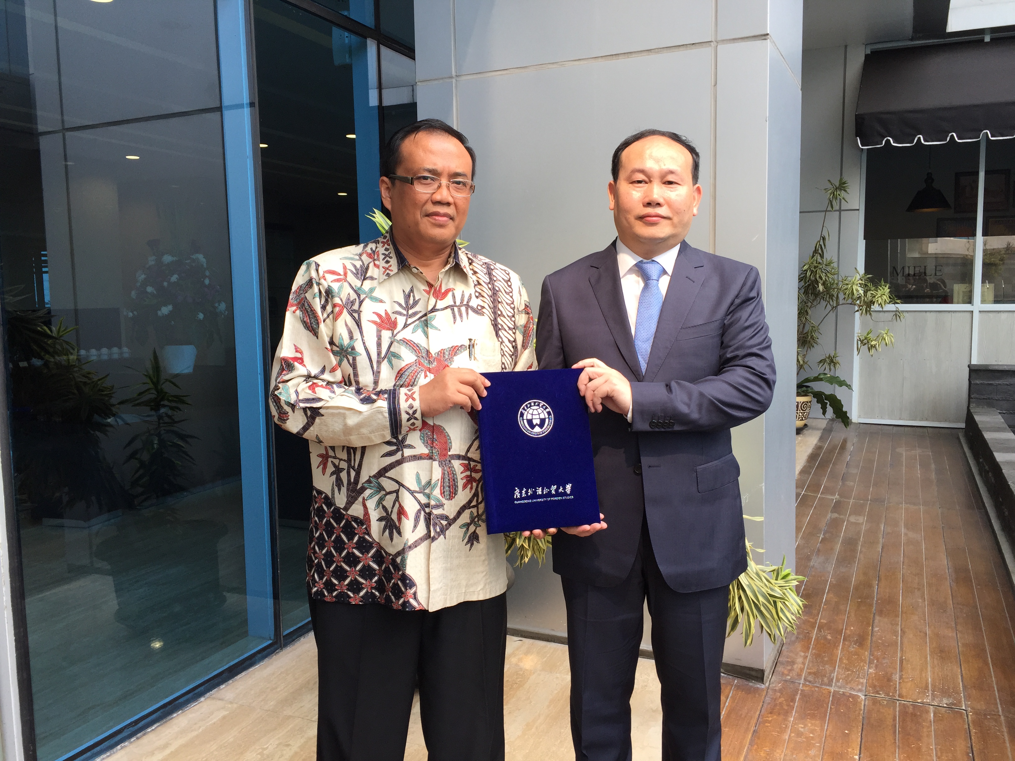 On the morning of 26th May, YANG met with Doctor Hasan Abdul Rozak, Principle of the Java Financial University at the hotel and signed an inter-school cooperation agreement. On the afternoon of the same day, the GDUFS delegation went to the Indonesian Ministry of Education to attend the University President’s Form between China and Indonesia. Those who attended were officials of the Ministry of Education of both China and Indonesia, officials of prestigious universities of China and Indonesia and representatives of the International Exchange and Cooperation Department.