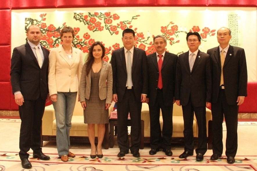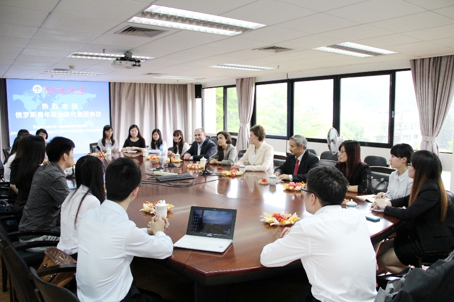 On the afternoon of April 23rd, a delegation of Russian Youth Statesmen visited our school. The delegates included members of the Russian Youth Public Chamber, Margarita Fedotova, Irina Filatova, and Konstantin Ryabov, the Chief Representative of the Russia-Asia Industry Entrepreneurs Union and LIU Weining. As well, leaders from the Provincial League Committee accompanied the delegation. GDUFS President, ZHONG Weihe and Vice-Secretary of the School's CPC Committee, LU Jinghui, met with the guests in the VIP Lounge. Secretary of the School Youth League Committee, XIE Xiulan and Acting Director of the GDUFS International Office, CAI Hong, also attended the meeting. HU Quan, a postgraduate and Russian Language Major, acted as an interpreter, and presided over the meeting.