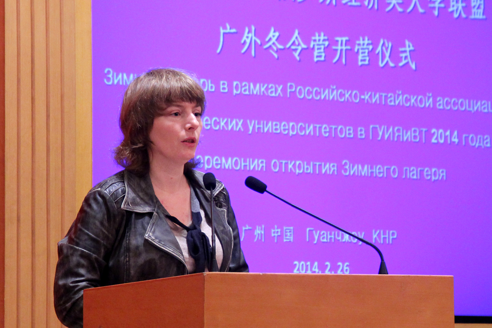 President Zhong firstly gave a warm welcome to all attending the ceremony. He pointed out that 2014 is the Year for the China-Russia Youth Exchange, determined by Chairman XI Jinping and President Putin and therefore this GDUFS winter camp represents a remarkable part of the Youth Exchange program. Furthermore, President Zhong expressed the expectation that all students would be proactive in the course of their studies, thinking for themselves and questioning ideas and concepts presented frequently. Too, he hoped that students could play an active role in communication and interaction, paving the way for building a bridge of Chinese and Russian friendship.