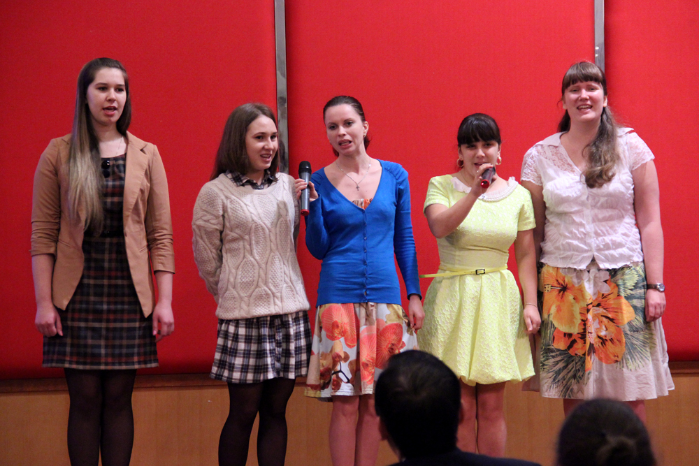 A Russian student named Алик said she wanted to become a diplomat after graduation and she hoped to have opportunities to work in China. To add variety, five girls sang the song Катюша, on the spot.