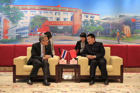President Zhong Weihe and Vice President Fang Fanquan held a warm reception for Mr. Suvanajata and his staff. Mr. Suvanajata has been dedicated to the mutual exchanges between China and Thailand and has offered great support for the development of our teaching and research in Thai language. On behalf of GDUFS, President Zhong expressed gratitude to Mr. Suvanajata for his great efforts and delivered concerns about recent floods in Bangkok. In return, Mr. Suvanajata shared his appreciation for GDUFS' support of projects run by the Thai Consulate and declared that GDUFS is like a second home for him.