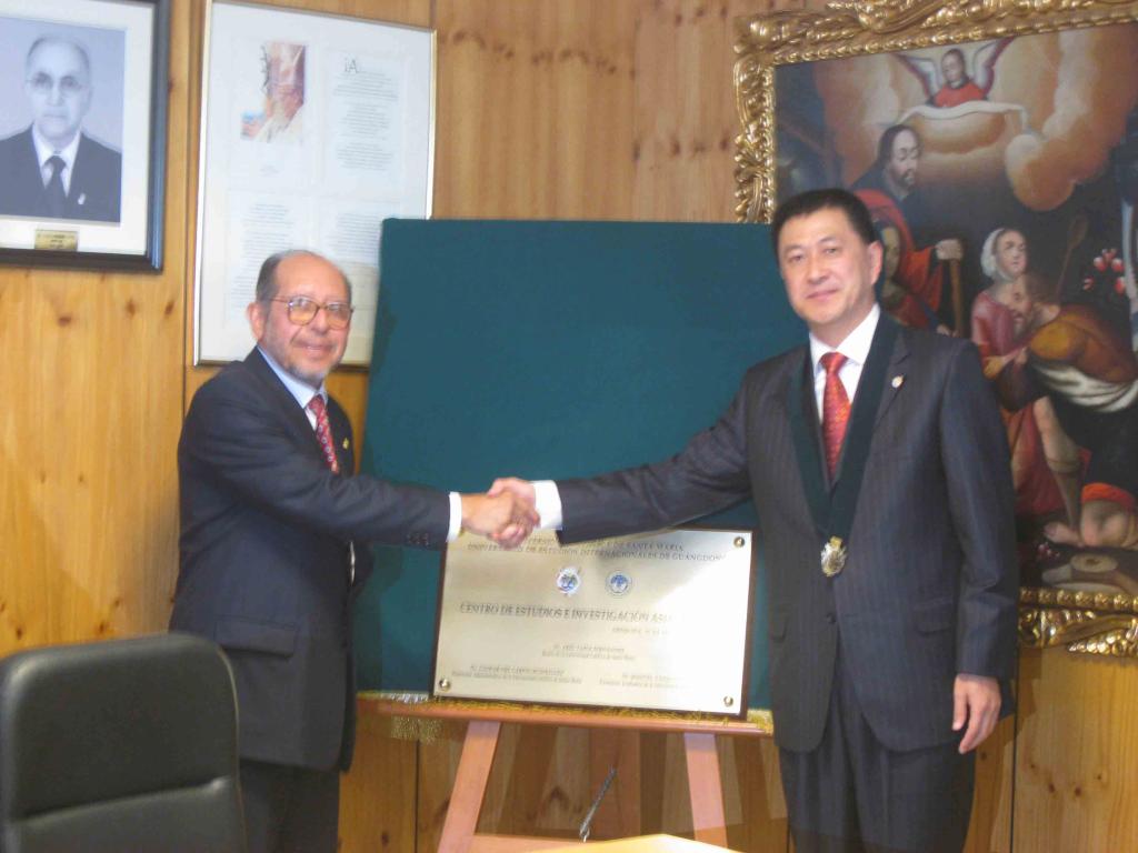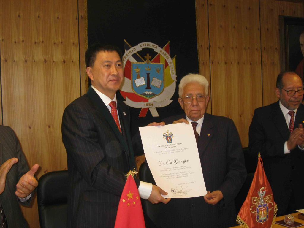 A meeting was held on November 10th that was attended by the following leaders from both universities: President of Santa Maria Catholic University Mr.Abel Tapia Fernandez; Former President Mr. Julio Ernesto Paredes Nunez; Vice President aspar, Dean of Engineering and Law School Dean; and other school administrators. After the meeting, Mr. Abel Tapia Fernandez awarded Secretary Sui with the title of Honorary Scholar of Santa Maria Catholic University. Mr. Sui Guangjun together with Mr. Abel unveiled the new Asia-Pacific Research Center of Santa Maria Catholic University. Later, the Mayor of Arequip, Simon Balbuena, granted Secretary Sui Honorary Citizen of Arequip. In his thank you speech, Mr. Sui xpressed his excitement about receiving the title. He said he was greatly impressed by the beauty and wonder of the great city of Arequip, and he would put forth his greatest effort in promoting development between the sister cities of Guangzhou and Arequip.
