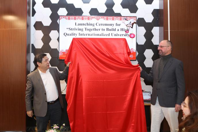On December 30, the 2020 Seminar on the education of foreign teachers, Hong Kong, Macao and Taiwan teachers (hereinafter referred to as “foreign teachers”) was held in the newly-built foreign teachers’activity room of the “The Foreign Teachers’ Home” on the first floor of the foreign experts building in the north campus. Jiao Fangtai, vice president of our school, delivered a speech. At the meeting, the activity themed “welcoming the new year and striving together to build a high quality internationalized university” was launched.