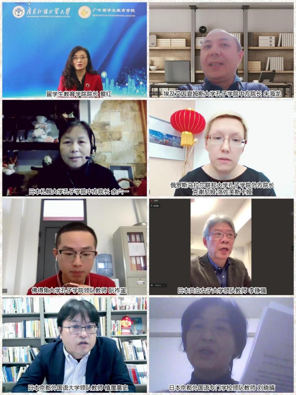 Cai Hong, dean of the Institute of Education for international students of GDUFS; Yu Liuyi, Chinese dean of the Confucius Institute of Sapporo University in Japan; Keshenia lozovskaya, foreign dean of the Confucius Institute of the Ural Federal University in Russia; Zhou Fuqiang, Chinese dean of the Confucius Institute of the University of Cape Verde; Zhu Hailong, Chinese dean of the Confucius Institute of the University of Aynshams in Egypt; Men Douqing, director of the International Project Center of Kobe Women's College University in Japan; Li Zhengqiang, leading teacher of Kyodo Women's University in Japan; Takashi Ueya, leading teacher of Kyoto Foreign Studies University in Japan; Liu Xiaoqing, leading teacher of Kyoto foreign languages special school in Japan; and a total of 150 students from 8 schools in Russia, Egypt, Japan, Cape Verde and Cameroon all attended the online opening ceremony, which was presided over by Liu Ping, project director of the College of Foreign Student Education.