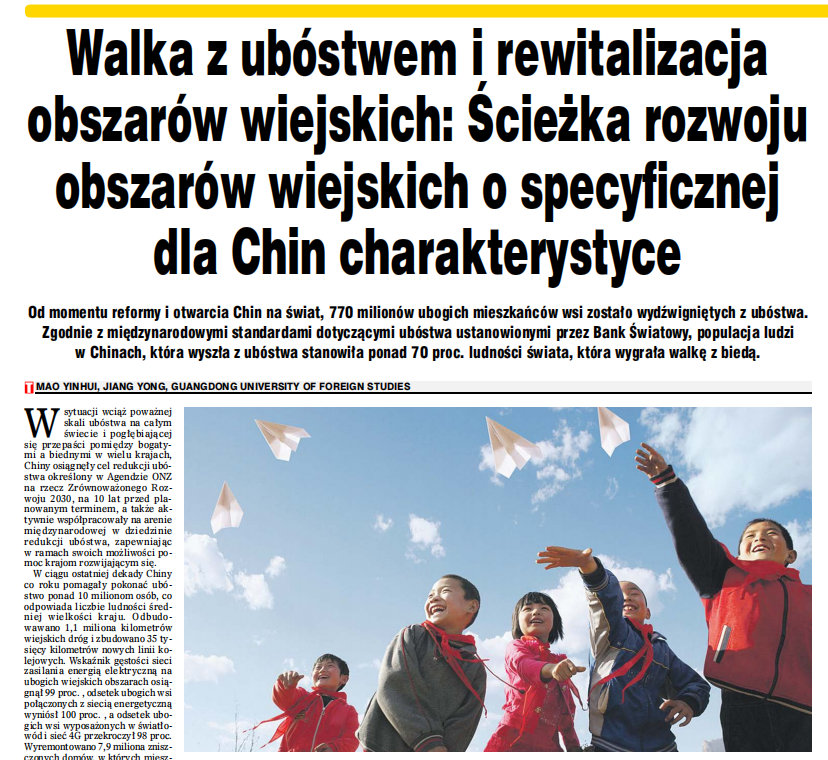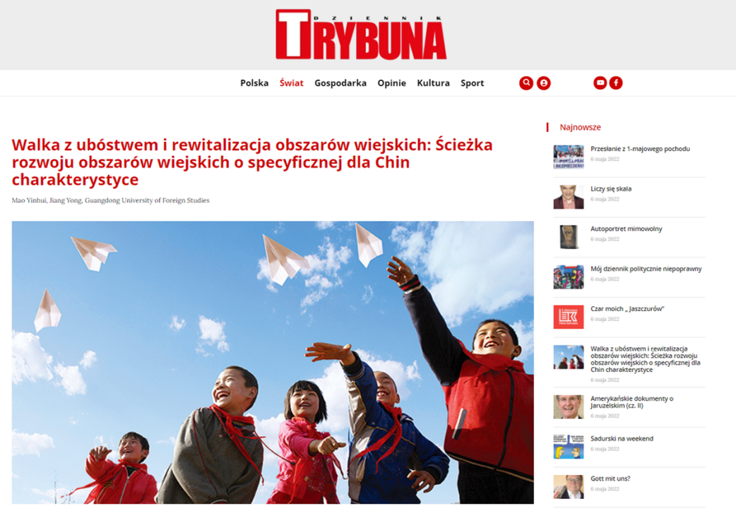 North Campus, Guangdong University of Foreign Studies, May 6th 2022: On May 6th, Tribune, the mainstream media in Poland, published the article “Poverty Alleviation and Rural Revitalization: The Road of Rural Development with Chinese Characteristics”, which written by professor Mao Yinhui and professor Jiang Yong of GDUFS. The article was displayed prominently within the magazine. With the purpose of propelling new progress in global poverty reduction, the article shared China’s experience in poverty alleviation, while appealing to the international community to strengthen cooperation in poverty reduction and development. The relevant links and reports can be found in both Tribune and China Daily.