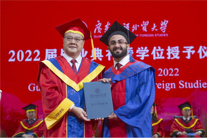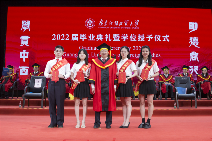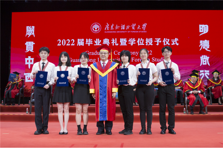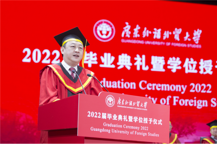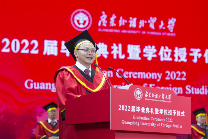 North Campus, Guangdong University of Foreign Studies, June 20th, 2022: On these brilliant days, the graduates of the class of 2022 have had their dazzling moment with great anticipation. The graduation and degree awarding ceremonies were held separately in the north and south campus on June 15th and 16th . Shi Youqi, Secretary of the Party Committee and President of GDUFS, awarded diplomas, set the tassels to the left side for graduate representatives and wished all the graduates all the best. The ceremonies were also broadcast online simultaneously. The university’s much-anticipated new gowns also made their debut at the ceremony.